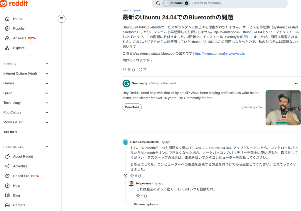 この日、仕事から帰って食事をして、パソコンを付けたところ、どうしてもBluetoothがつながらない。再インストールまでしたのに。どうしたものかと思って、色々と試しているうちに、このページ(https://www.reddit.com/r/Ubuntu/comments/1cf30qo/bluetooth_issue_on_latest_ubuntu_2404/?tl=ja)に行き着く。信頼のRedditである。