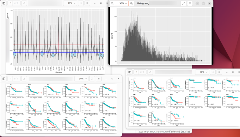 2025/12/14(日);初稿 2025/12/29(月);訂正;カプランマイヤー法による生存率の解析;教科書(生存期間解析、ISBN978-4-254-12861-1)に従って、打ち切りの設定を確認し、生存曲線(カプランマイヤー推定値)の横軸を1825日(5年)に限定した。 はじめに 以前、TCGA(The Cancer Genome Atlas)に登録されたデータをダウンロードしたが、ここで […]