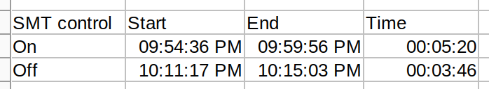 その結果、どうやらSMT controlを切った方が計算が早い、ということが示された。良かったというか何と言うか。ただし、なんか腑に落ちないんだけど。