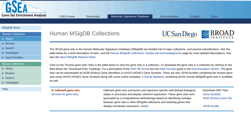 遺伝子シグネチャー(GMTファイルで提供する)としては、MsigDBのHallmark of cancerを使った。これは構成される遺伝子セットの数が50で、C2とかC7とかC8とか他のシグネチャーセットよりも圧倒的に少ないためである。ここ(https://www.gsea-msigdb.org/gsea/msigdb/human/collections.jsp)からダウンロードできる。