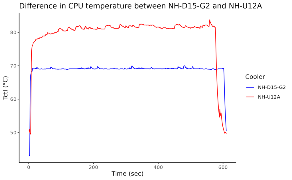 doneBash以下の図が結果である。赤線がNH-U12A、青線がNH-D15 G2の結果である。この結果を見たときにはけっこう衝撃だった。CPU16個をstressコマンドにより回し、CPUの温度(Tctl)を比較したわけだが、なんと、NH-U12Aは83℃まで上がったのに対し、NH-D15 G2は68℃くらいまでにしか上がらなかった。それに、そもそも、ベースラインの温度も8℃くらい違ってしまってる。ちなみに、部屋はエアコンを30℃に設定し、室温としては25℃くらいだった。そして、エアコンをずっと続けてもCPU温度は基本的に45℃くらいらしい。